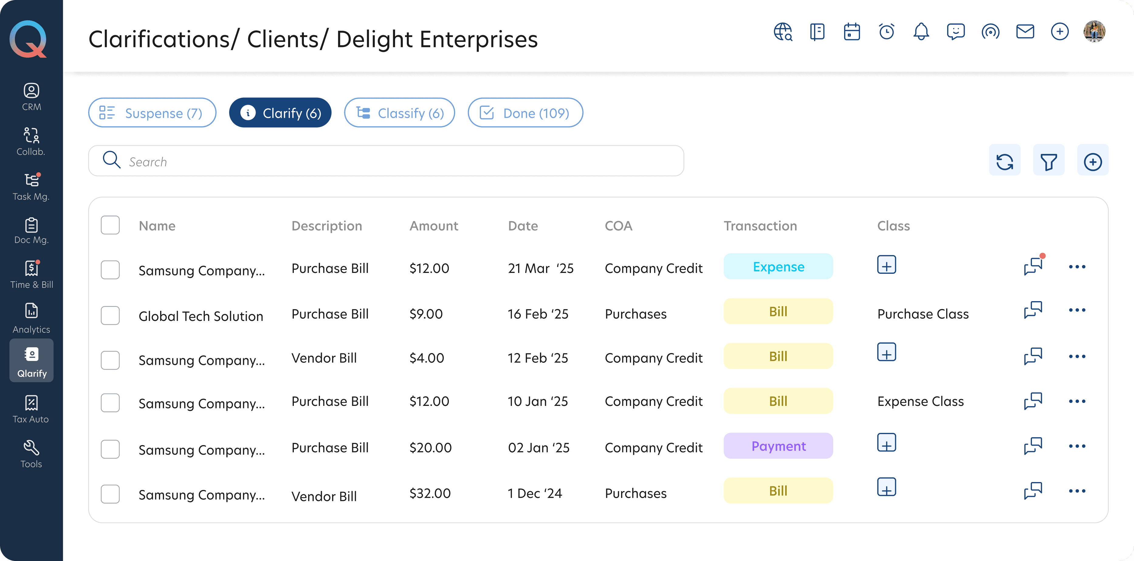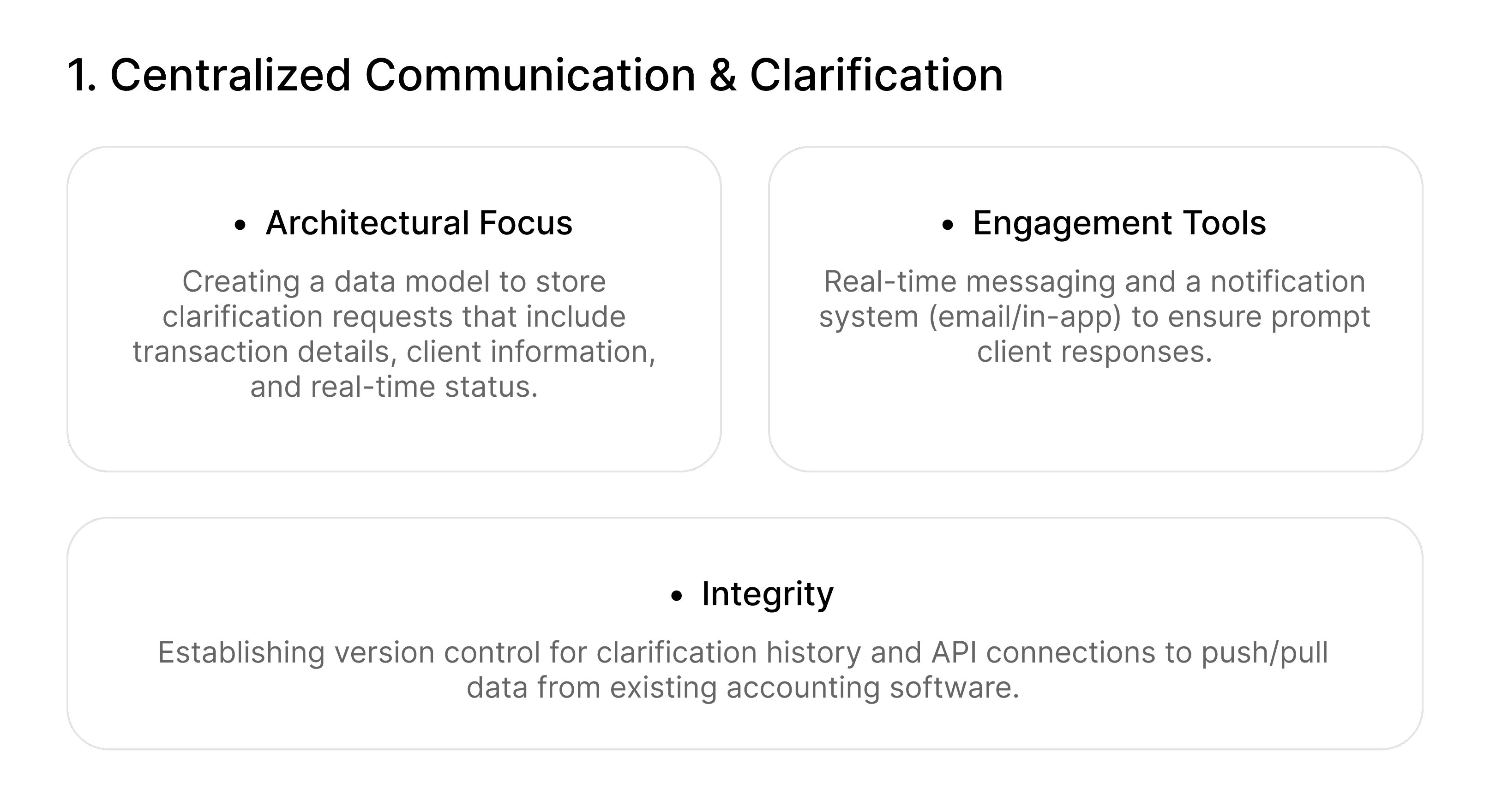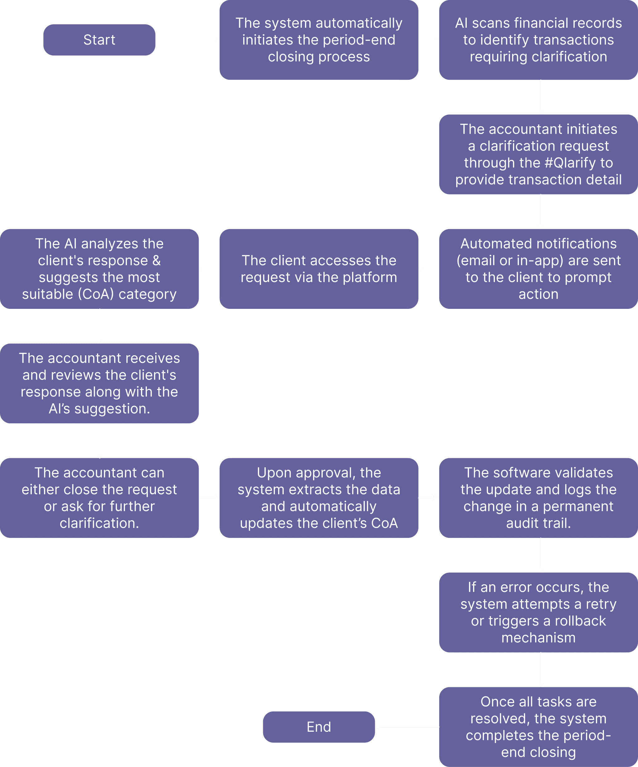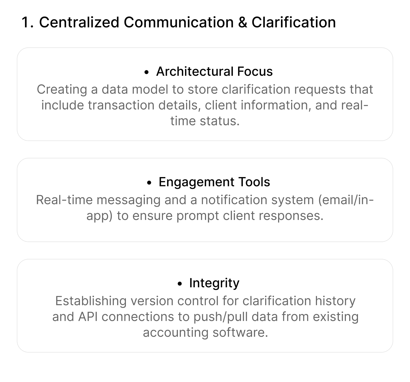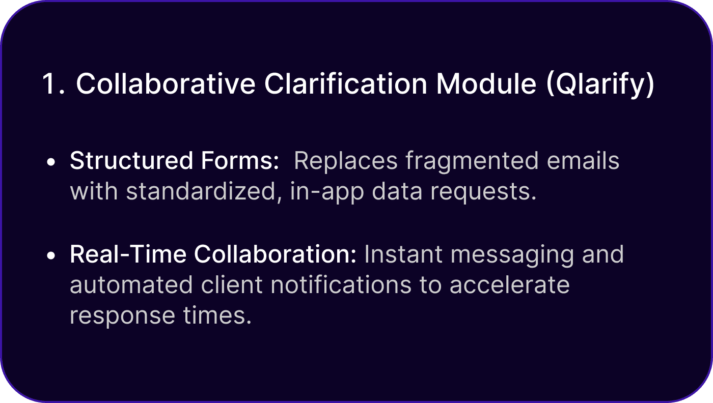 Qlarify was designed to solve this by integrating a collaborative clarification module directly into the accounting workflow, utilizing AI to bridge the gap between complex accounting data and client input.