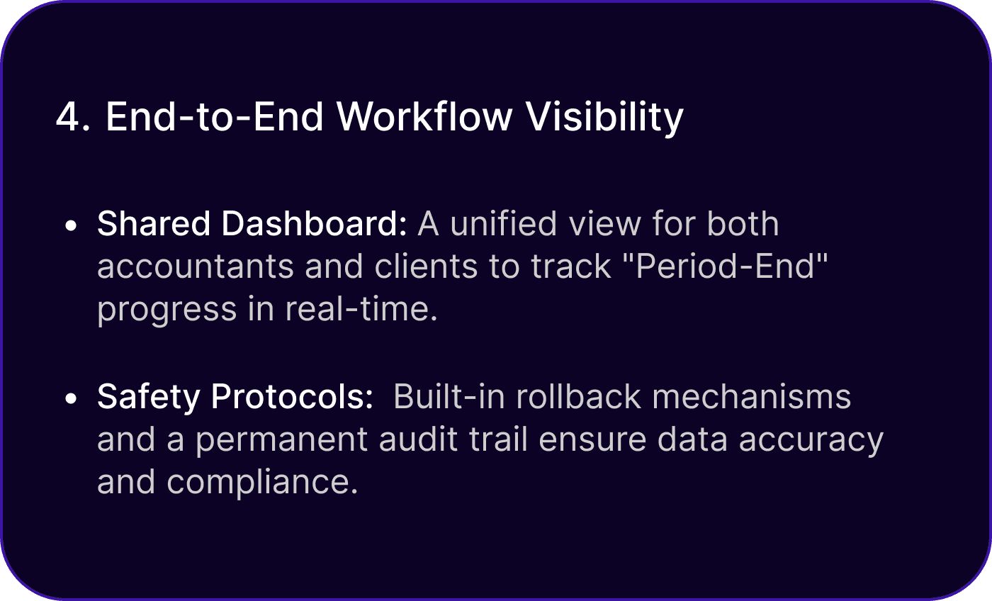 A unified view for both accountants and clients to track "Period End" progress in real time.