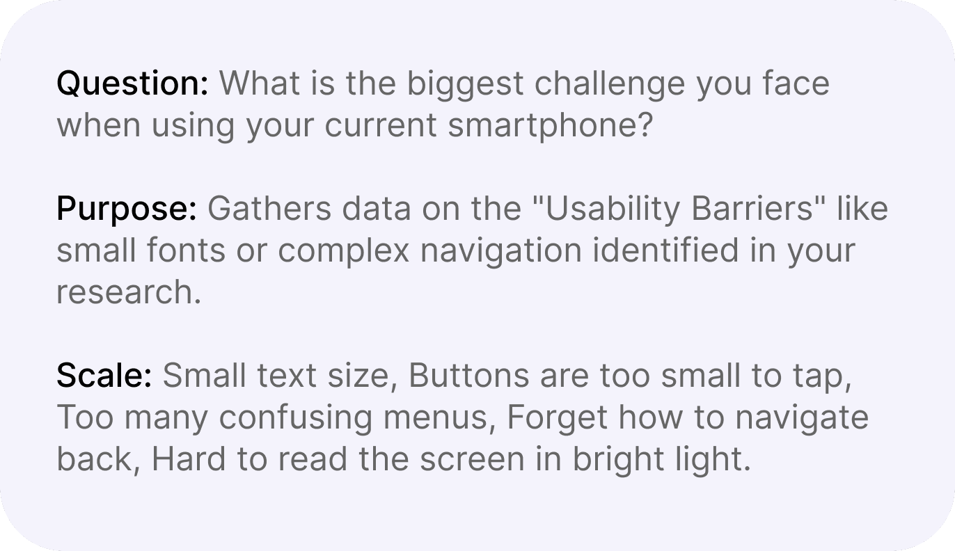 Purpose: Gathers data on the "Usability Barriers" like small fonts or complex navigation identified in your research.