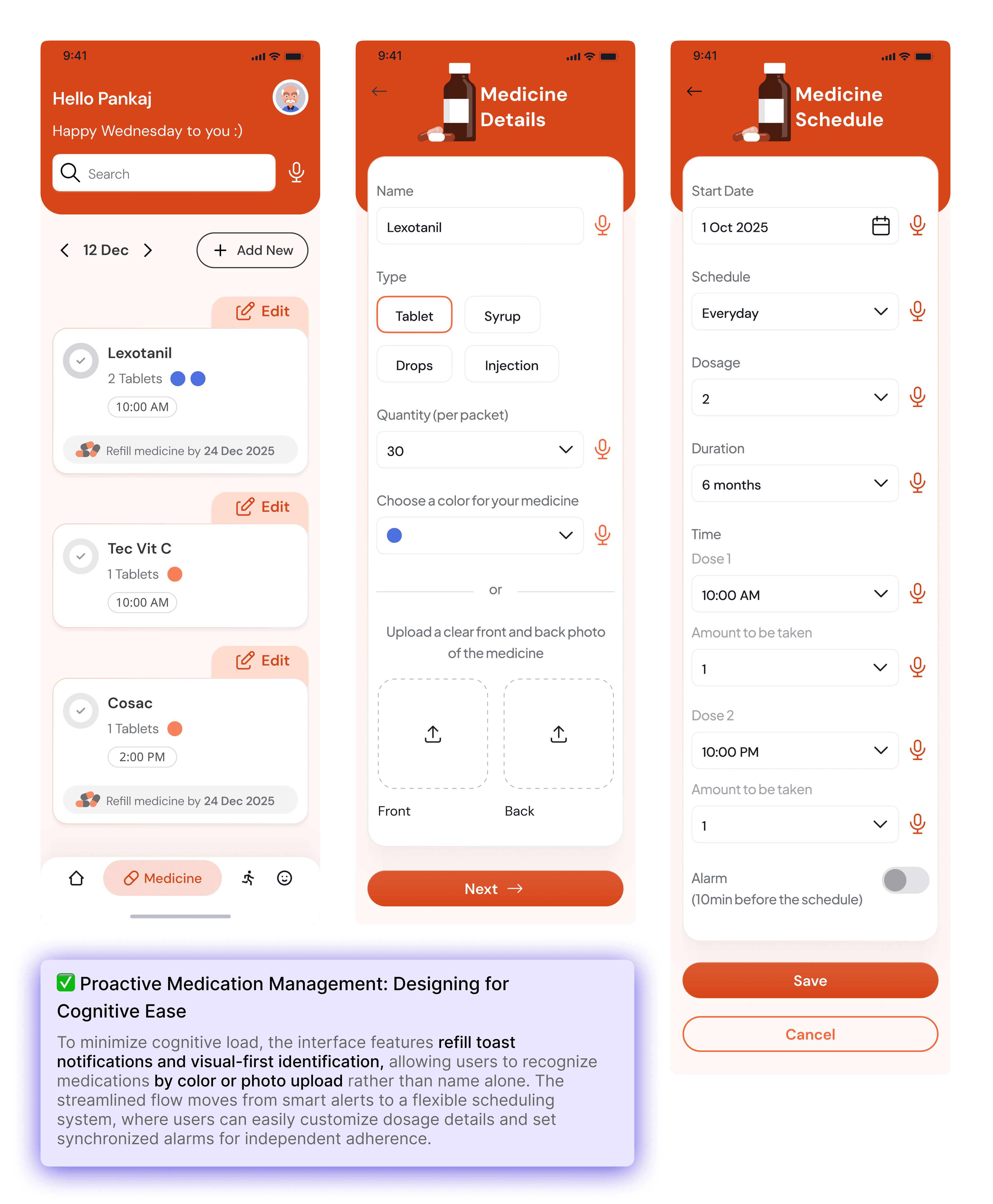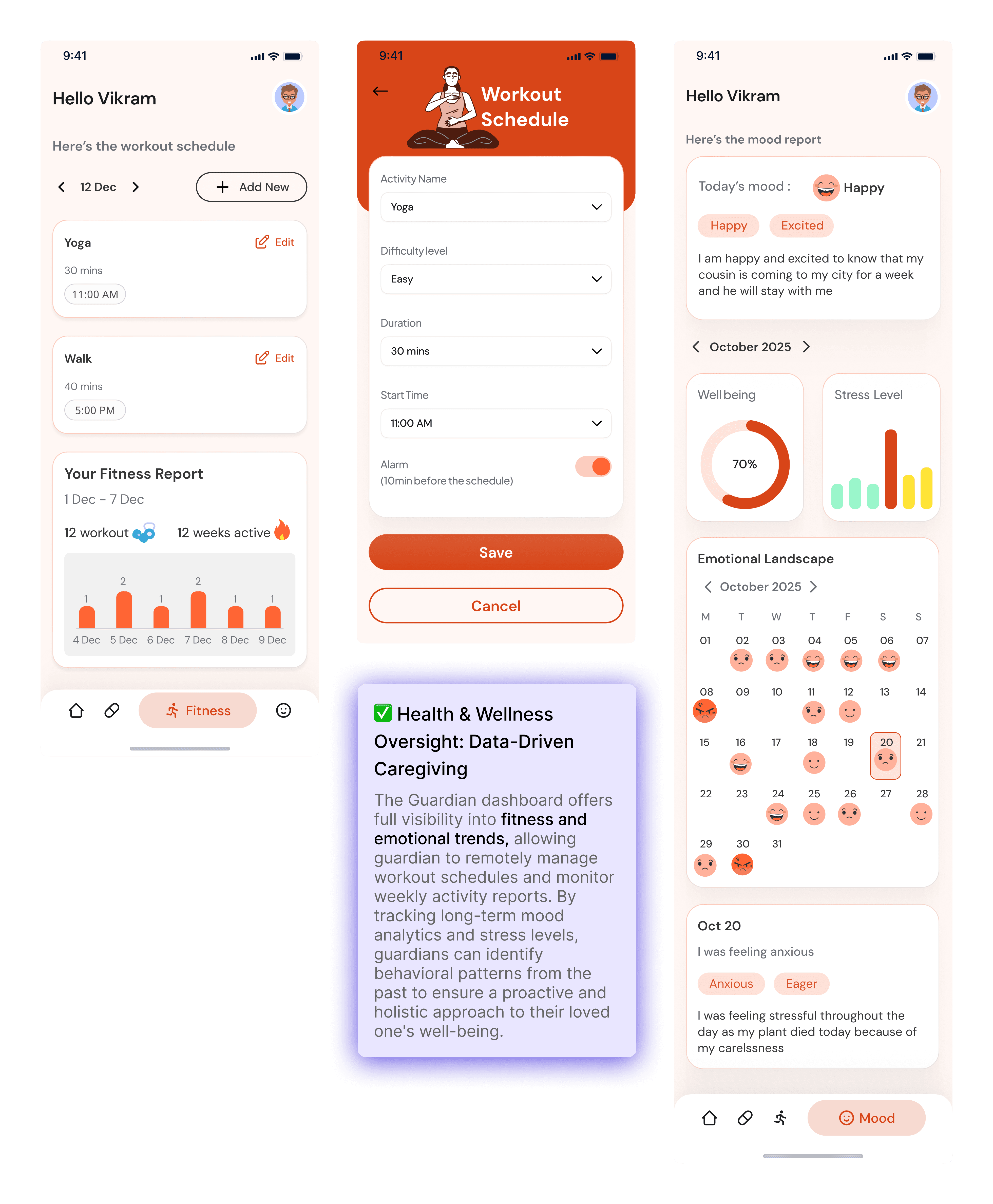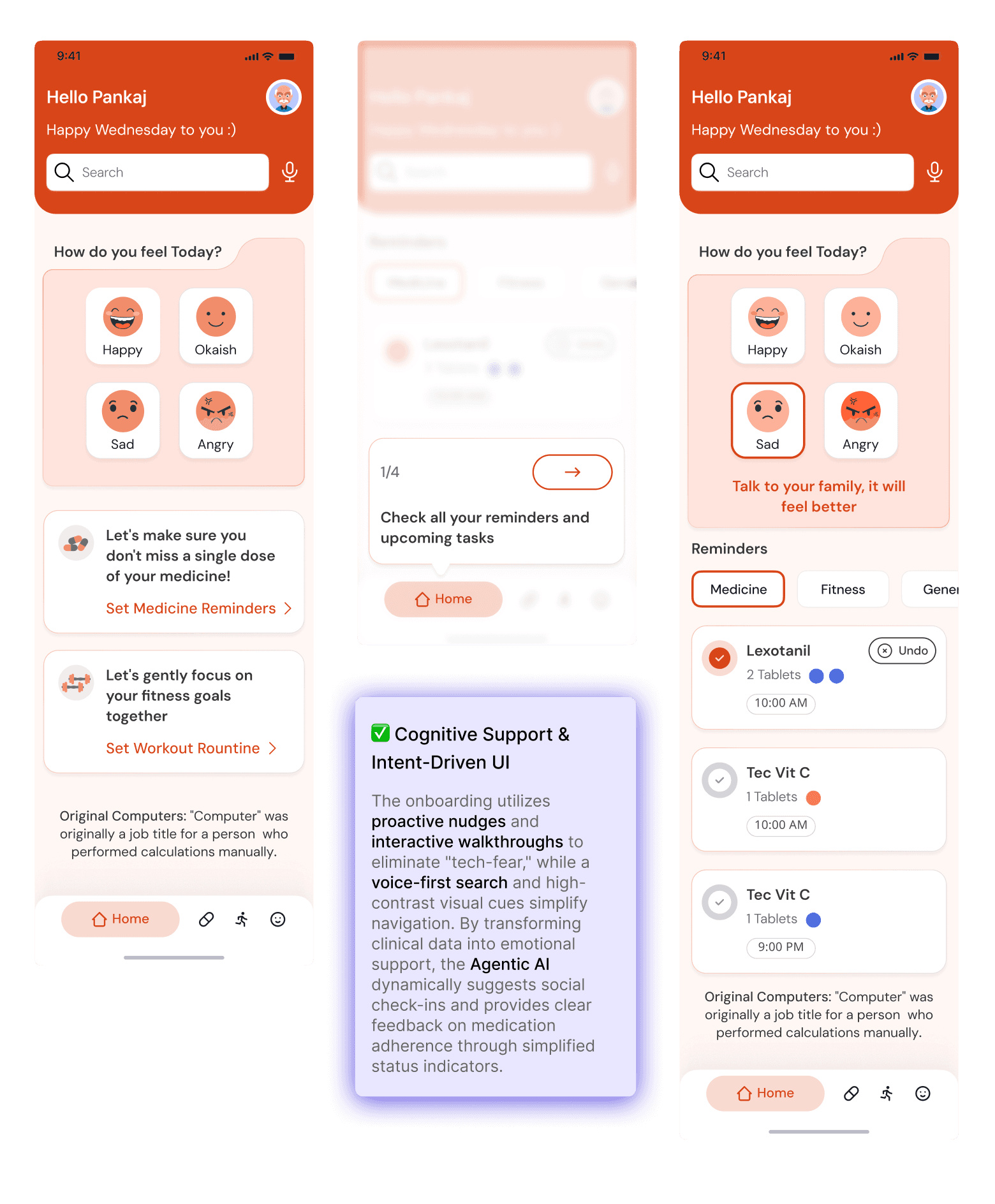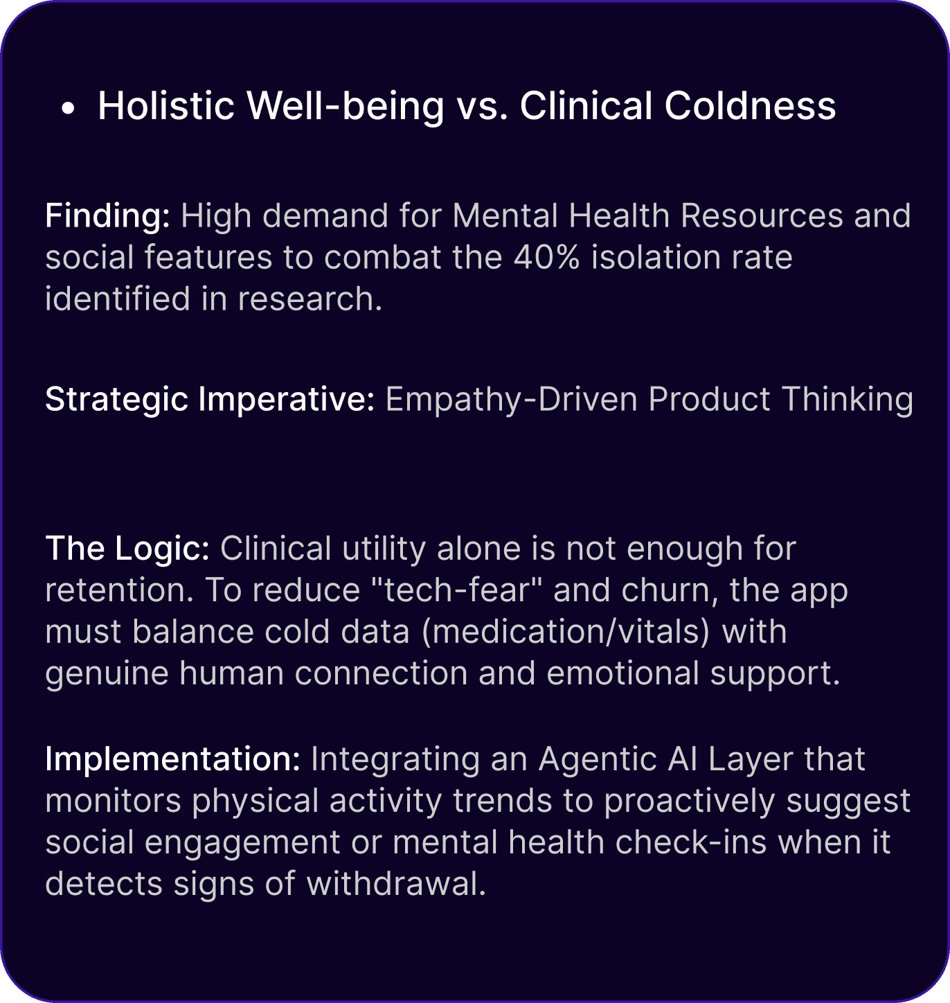 The Logic: Clinical utility alone is not enough for retention. To reduce "tech-fear" and churn, the app must balance cold data (medication/vitals) with genuine human connection and emotional support.