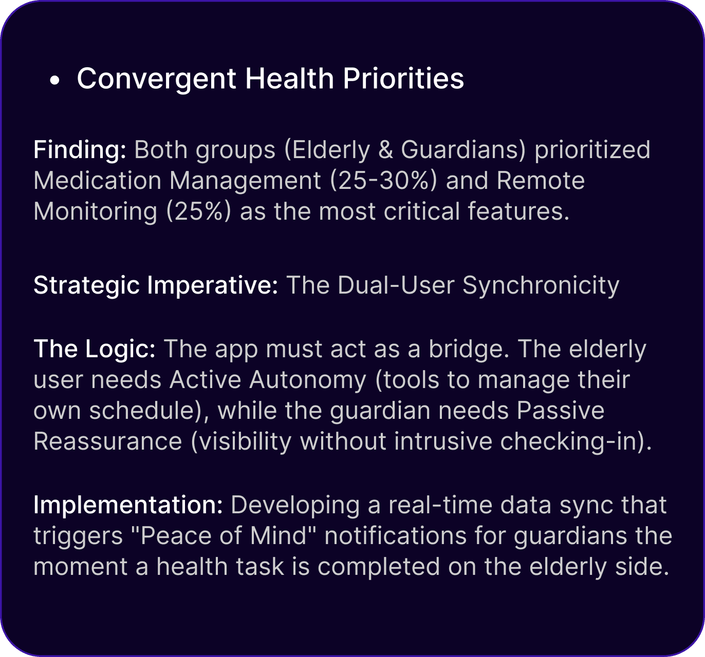 Finding: Both groups (Elderly & Guardians) prioritized Medication Management (25-30%) and Remote Monitoring (25%) as the most critical features.