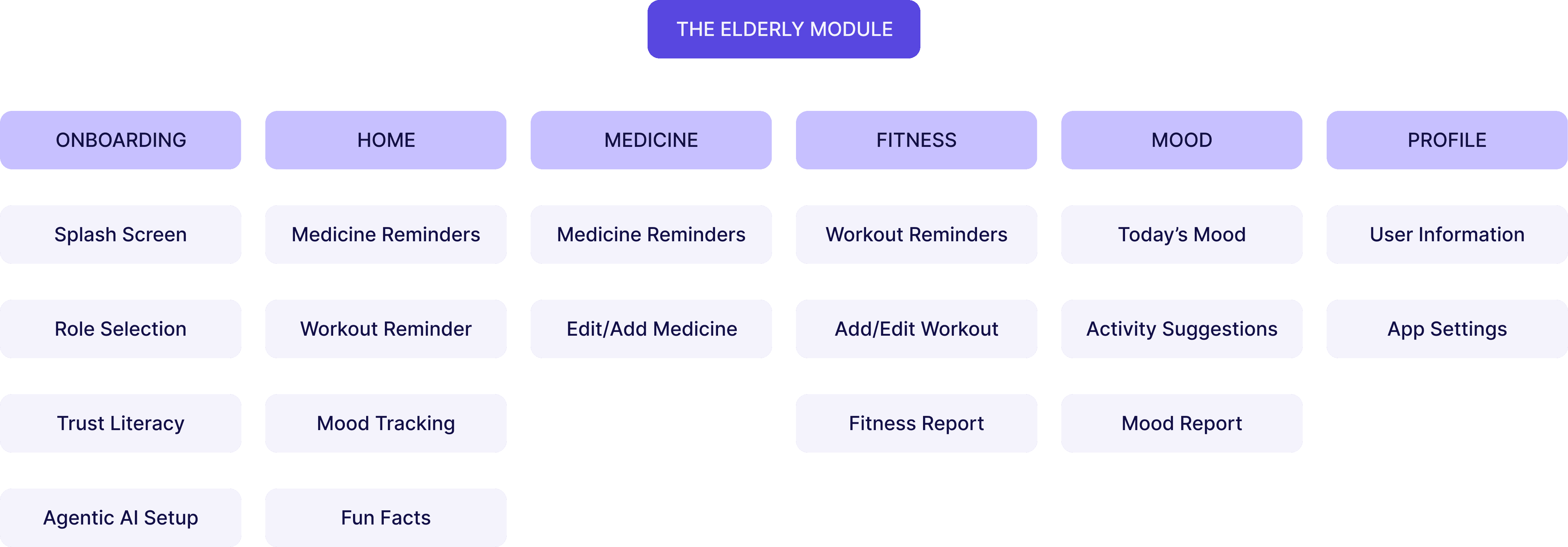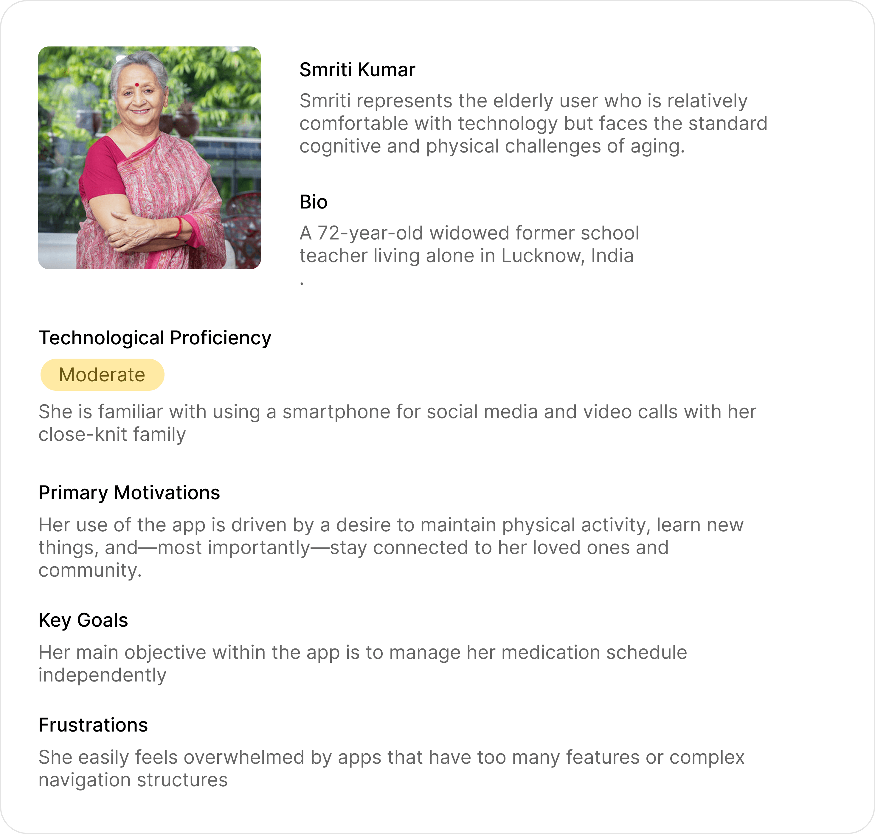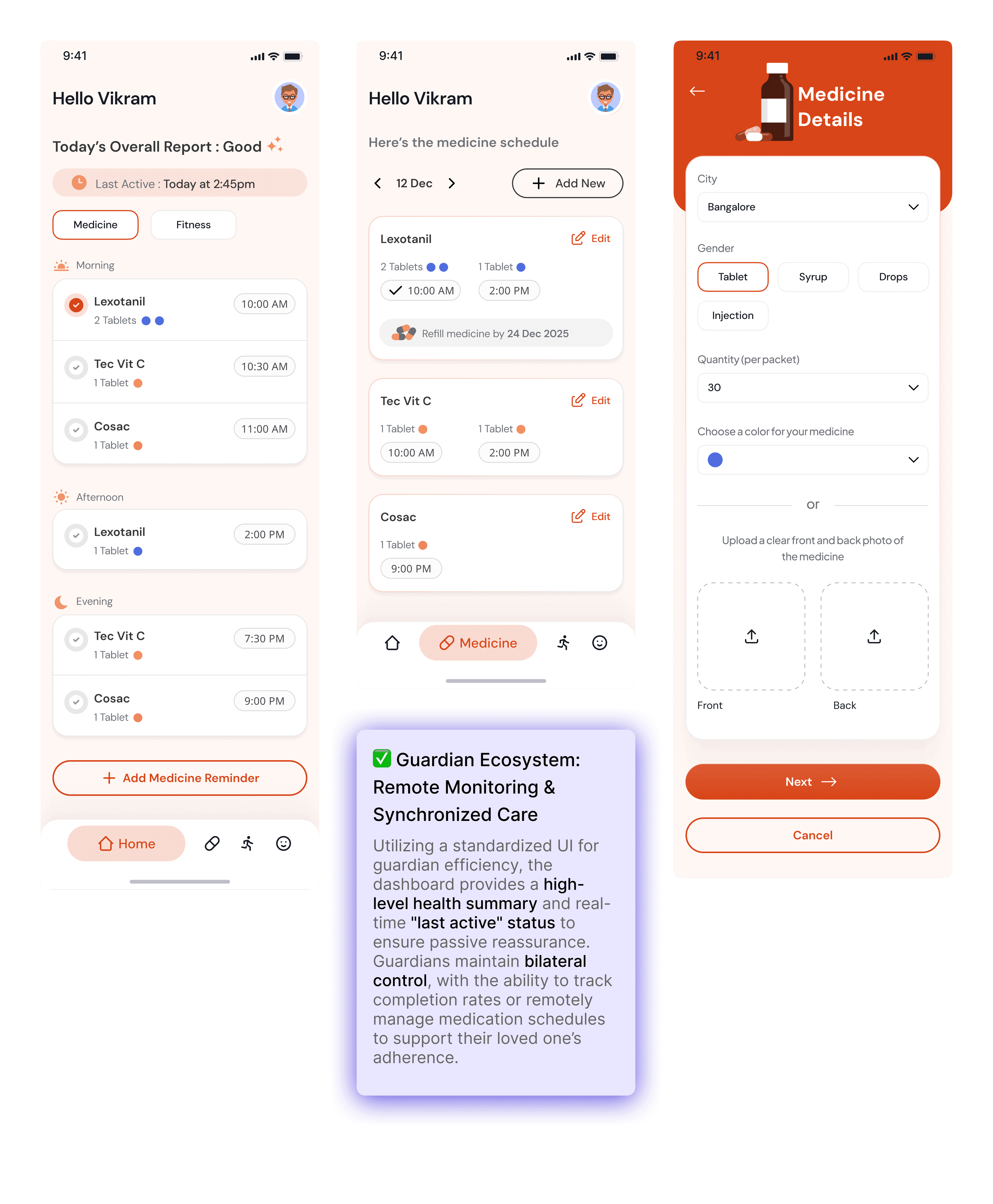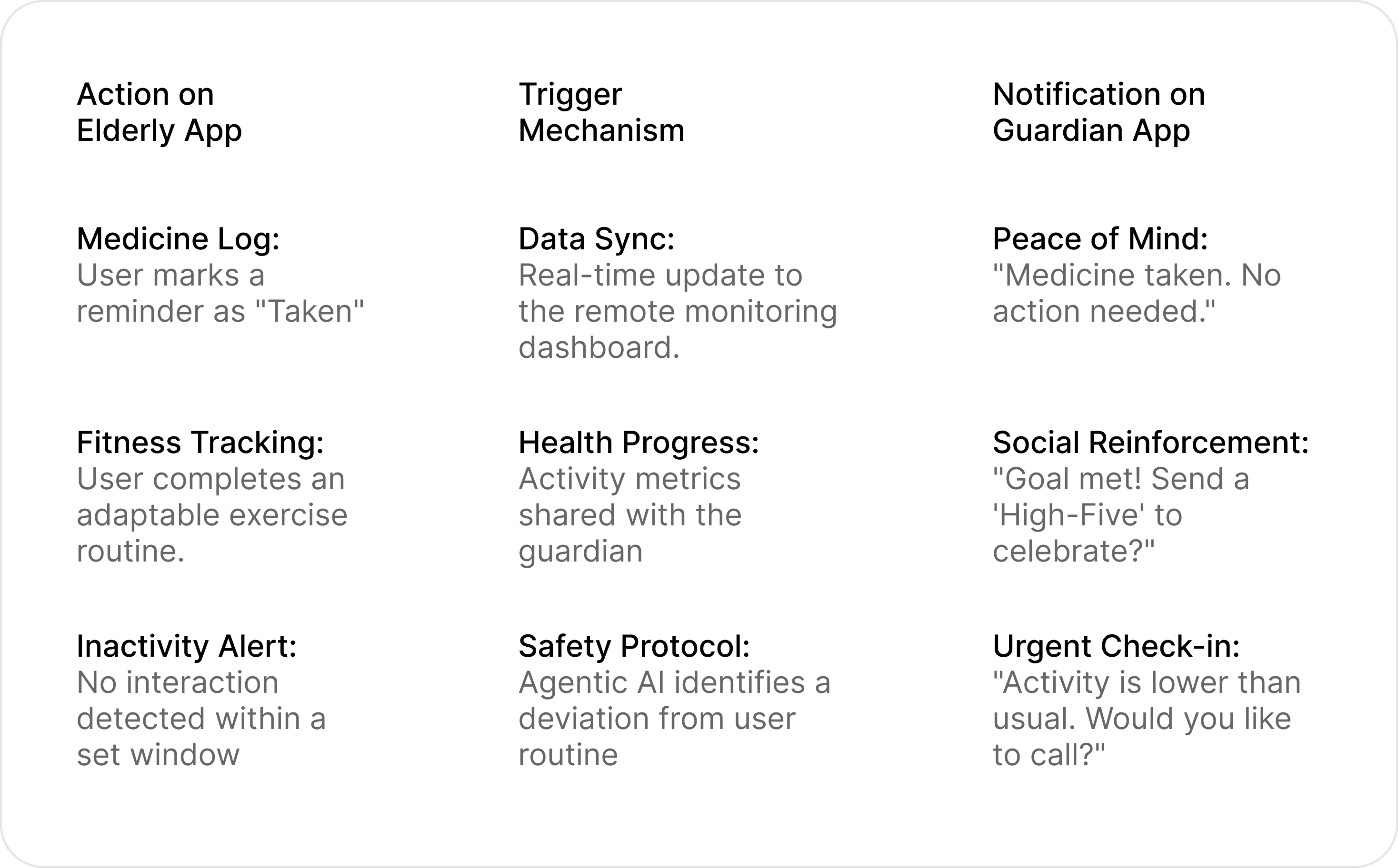 The Logic: The app must act as a bridge. The elderly user needs Active Autonomy (tools to manage their own schedule), while the guardian needs Passive Reassurance (visibility without intrusive checking-in).