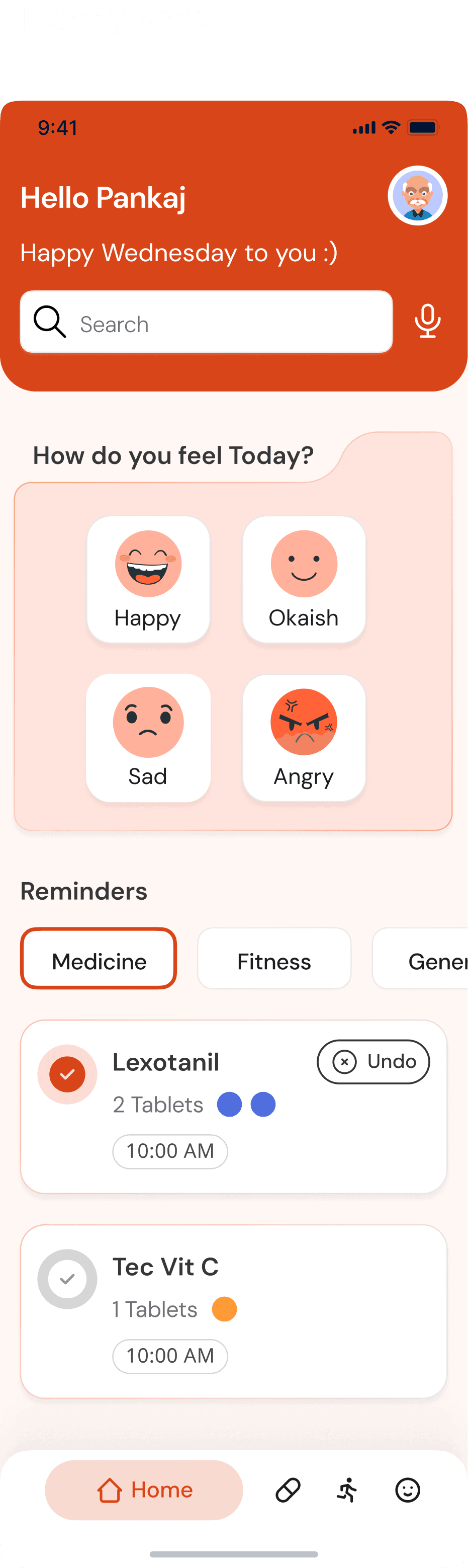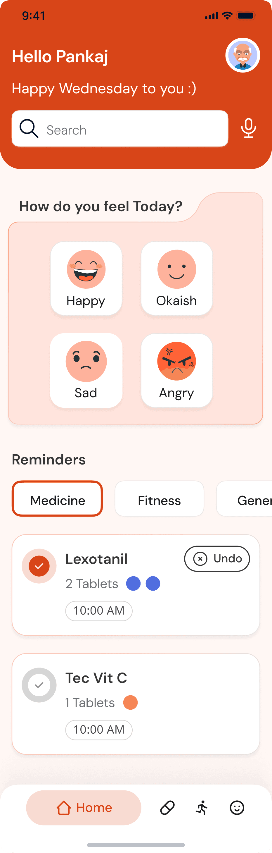 Options: Medication reminders, Video calls with family, Exercise routines, Mood tracking, Emergency SOS button.