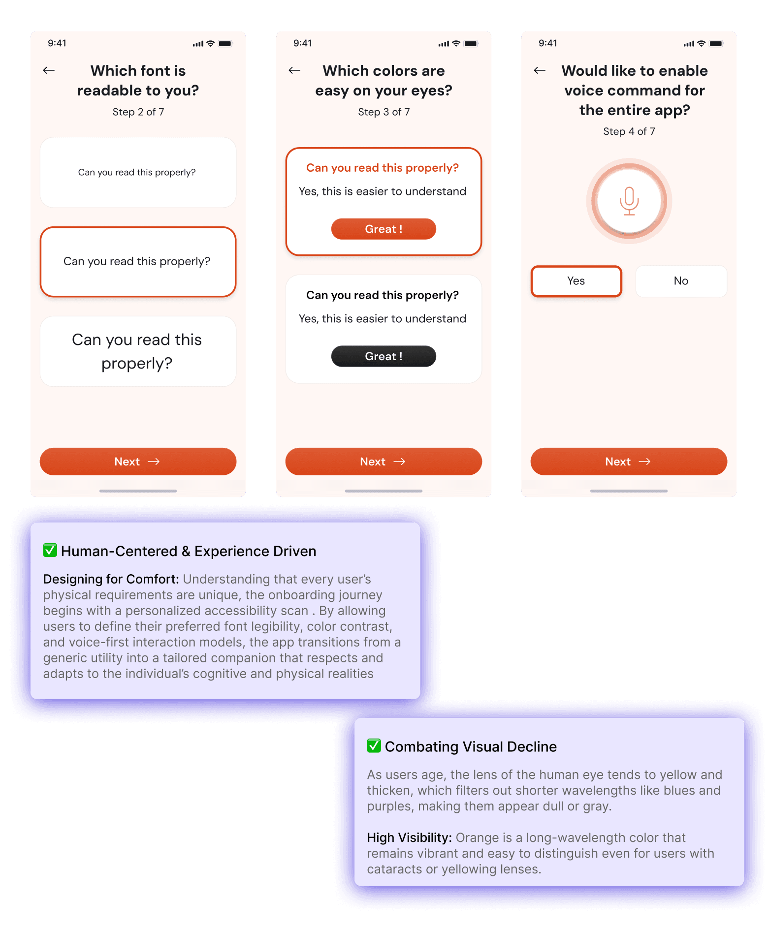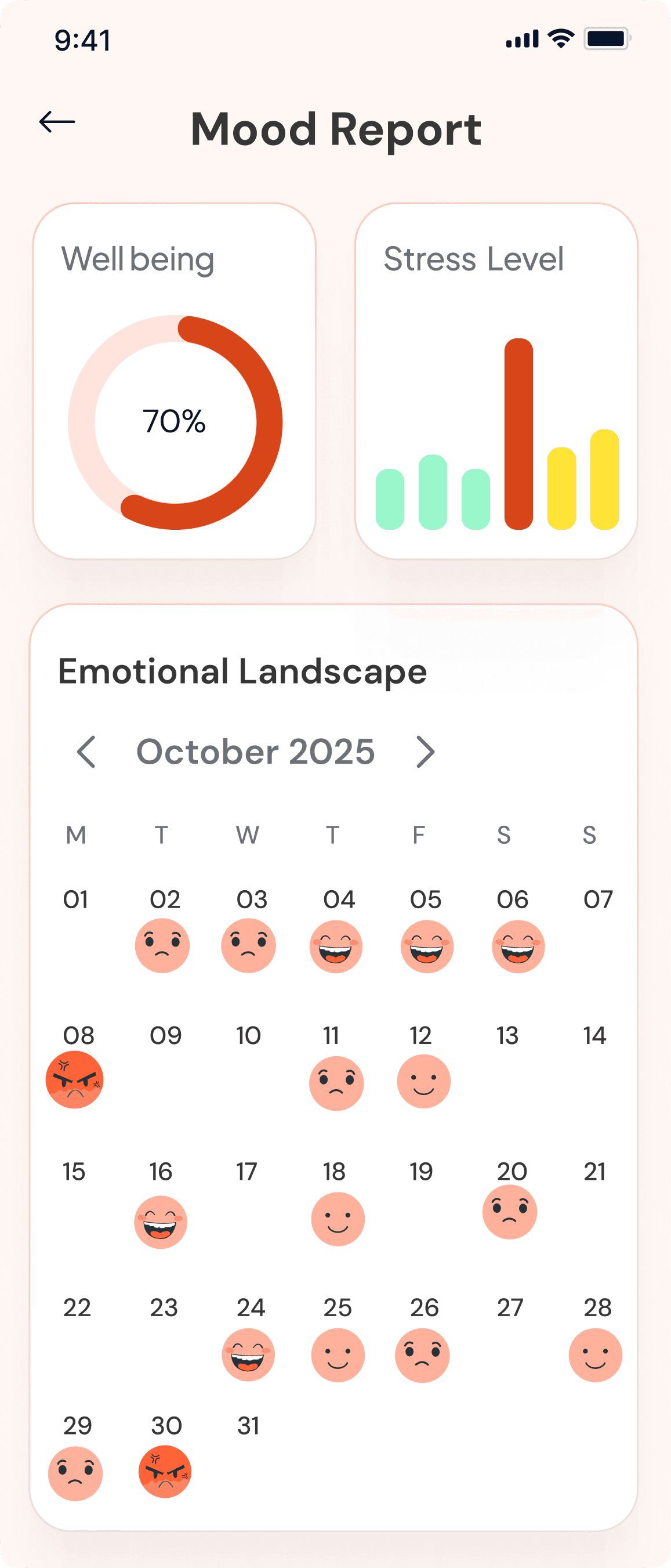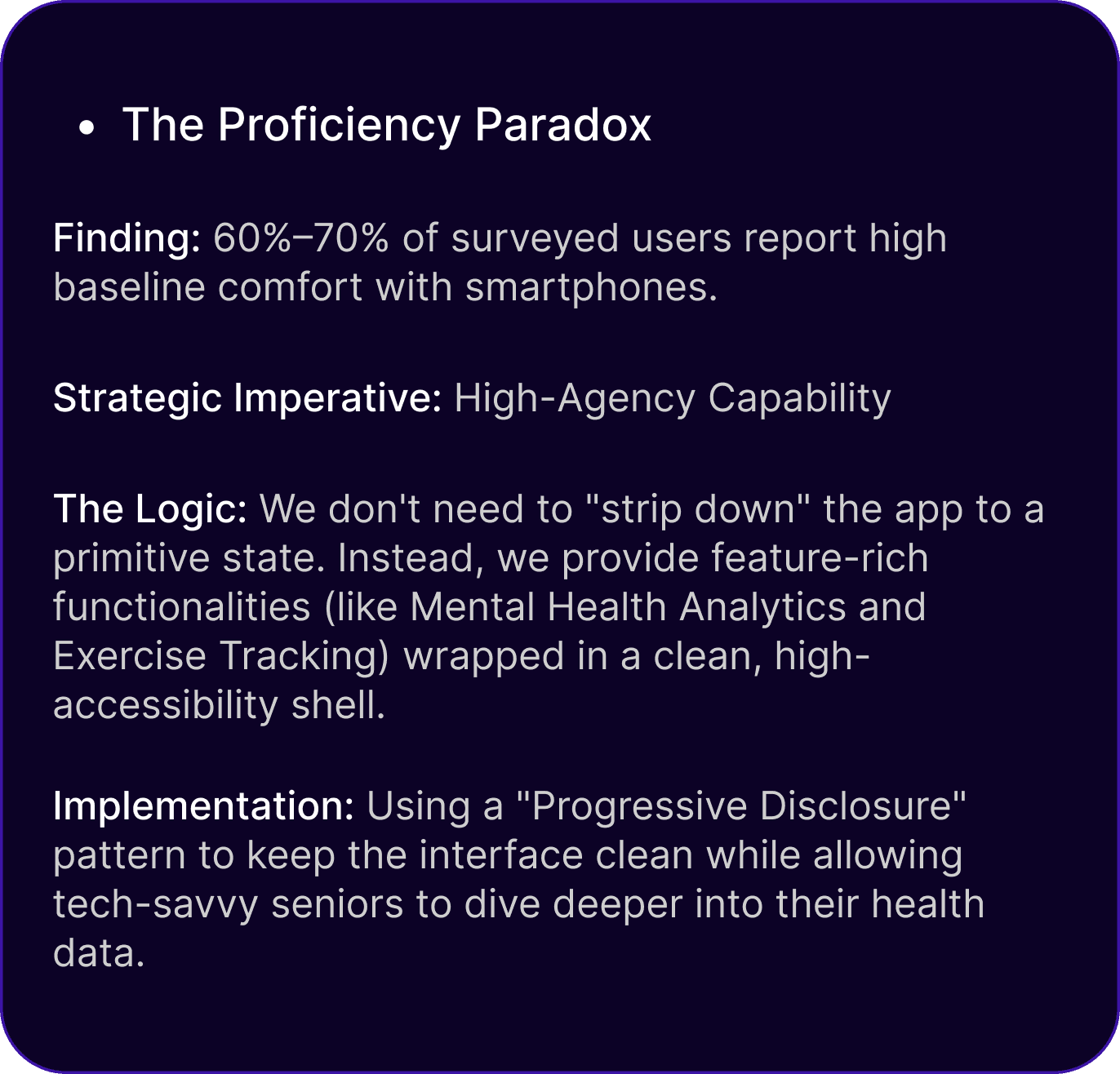 The Logic: We don't need to "strip down" the app to a primitive state. Instead, we provide feature rich functionalities (like Mental Health Analytics and Exercise Tracking) wrapped in a clean, high-accessibility shell.