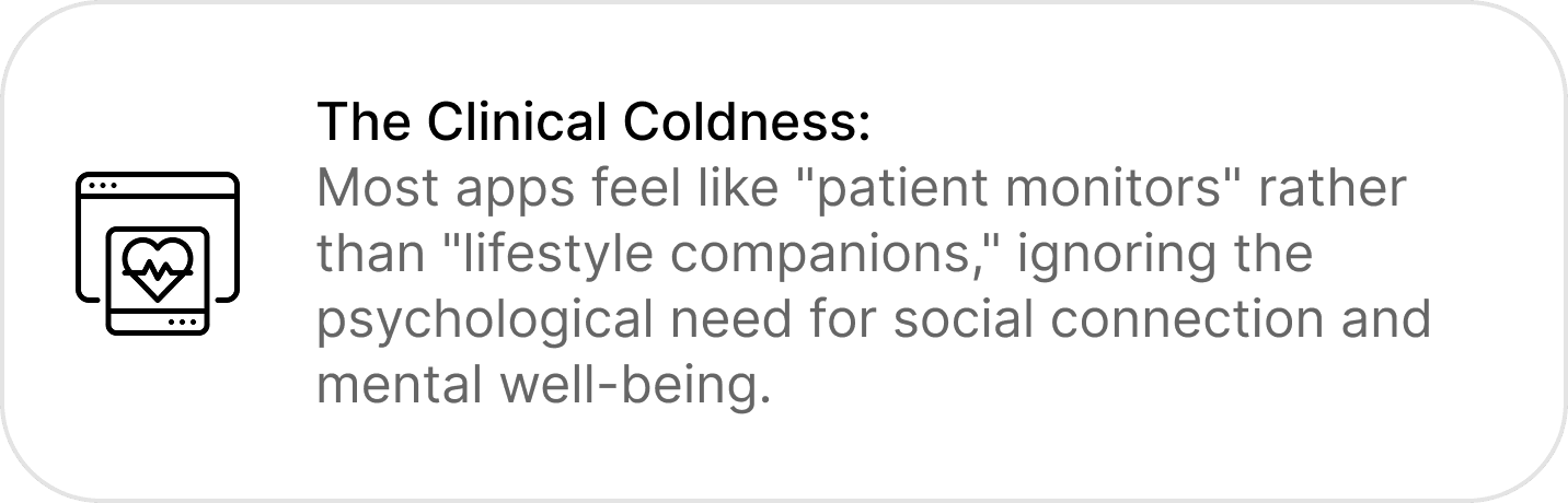 Most apps feel like "patient monitors" rather than "lifestyle companions," ignoring the psychological need for social connection and mental well-being.