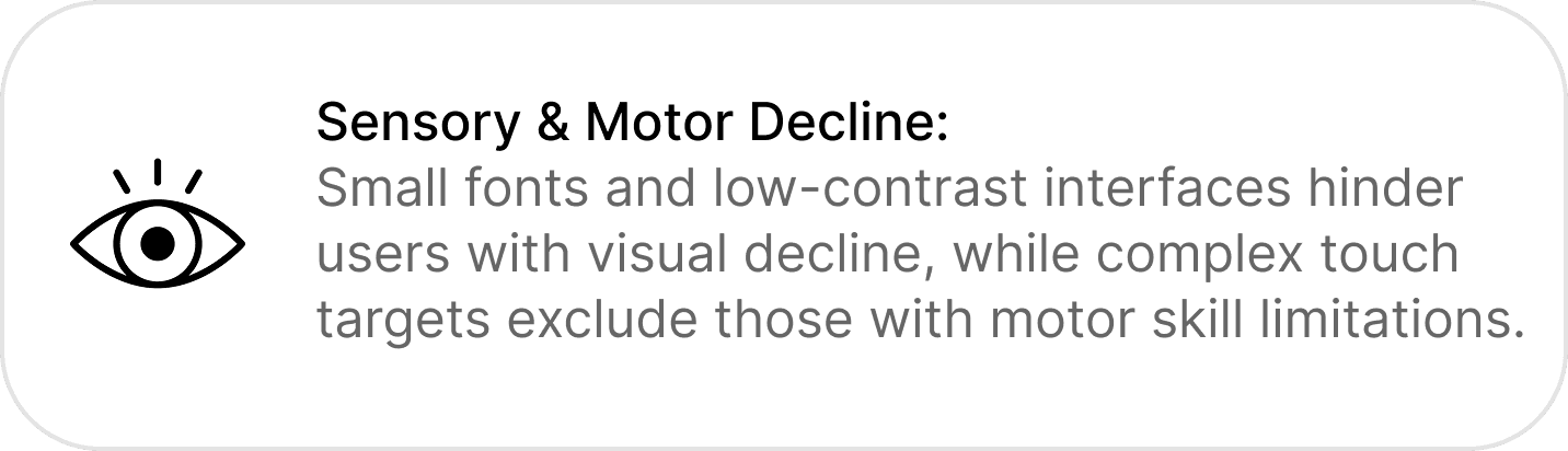 Small fonts and low contrast interfaces hinder users with visual decline, while complex touch targets exclude those with motor skill limitations.
