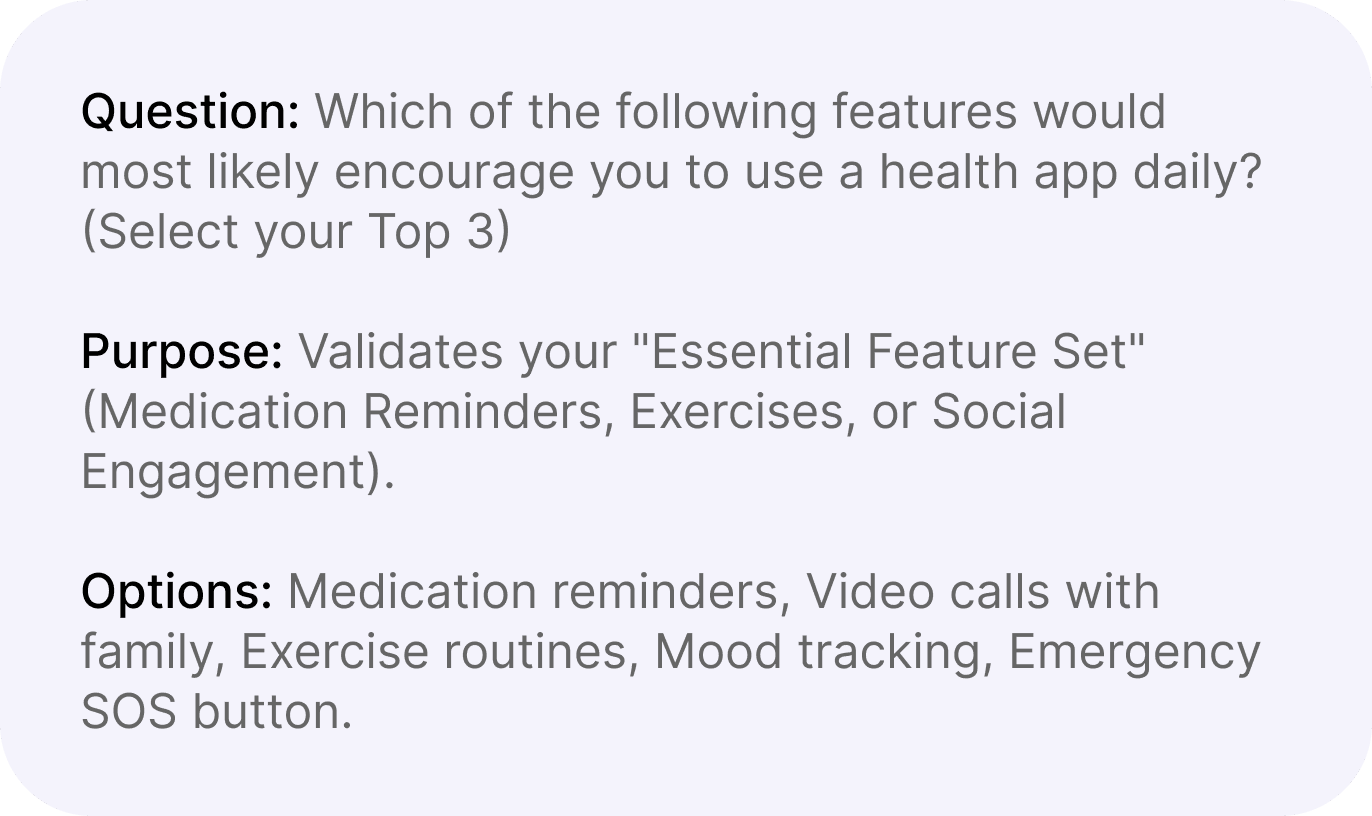Purpose: Validates your "Essential Feature Set" (Medication Reminders, Exercises, or Social Engagement).