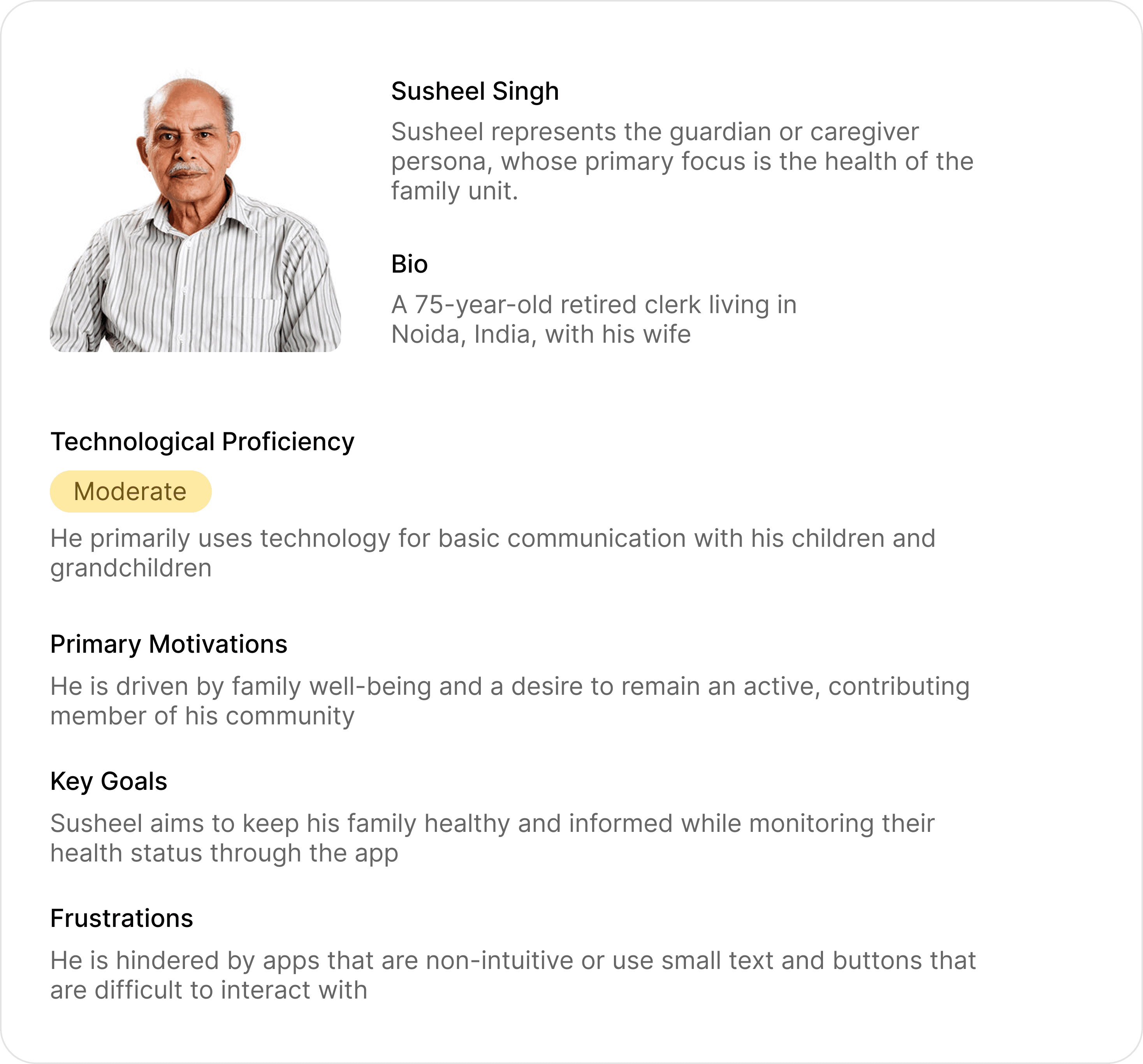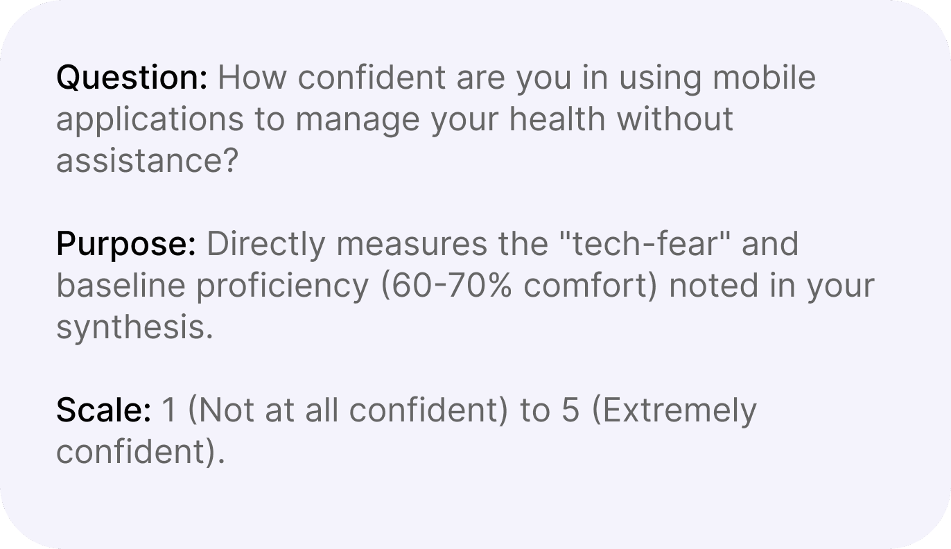 Quantitative Scope: Distributed a comprehensive survey to 10+ stakeholders to map the intersection of technological proficiency and health priorities. Some of the questions in survey were :