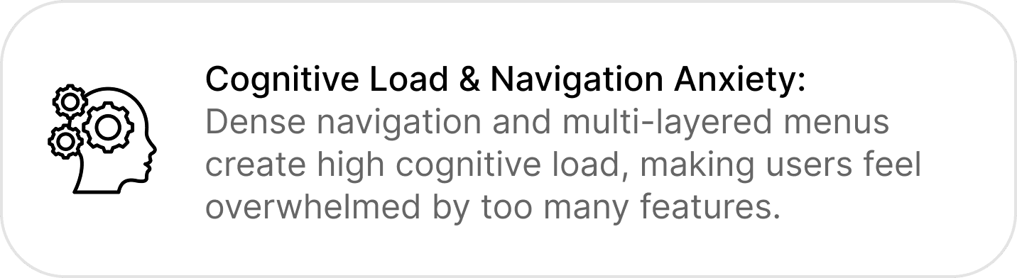 Dense navigation and multi layered menus create high cognitive load, making users feel overwhelmed by too many features.