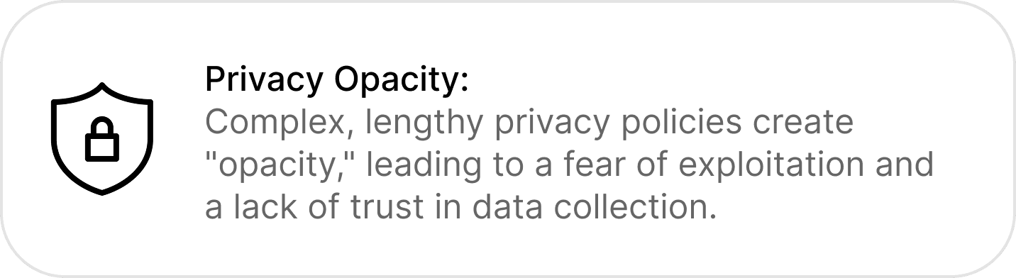 Complex, lengthy privacy policies create "opacity," leading to a fear of exploitation and a lack of trust in data collection.