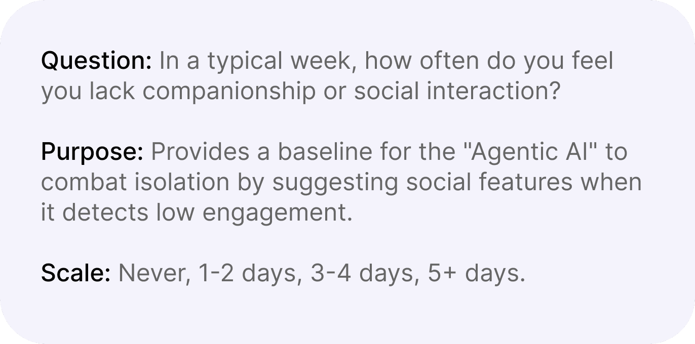 Purpose: Provides a baseline for the "Agentic AI" to combat isolation by suggesting social features when it detects low engagement.