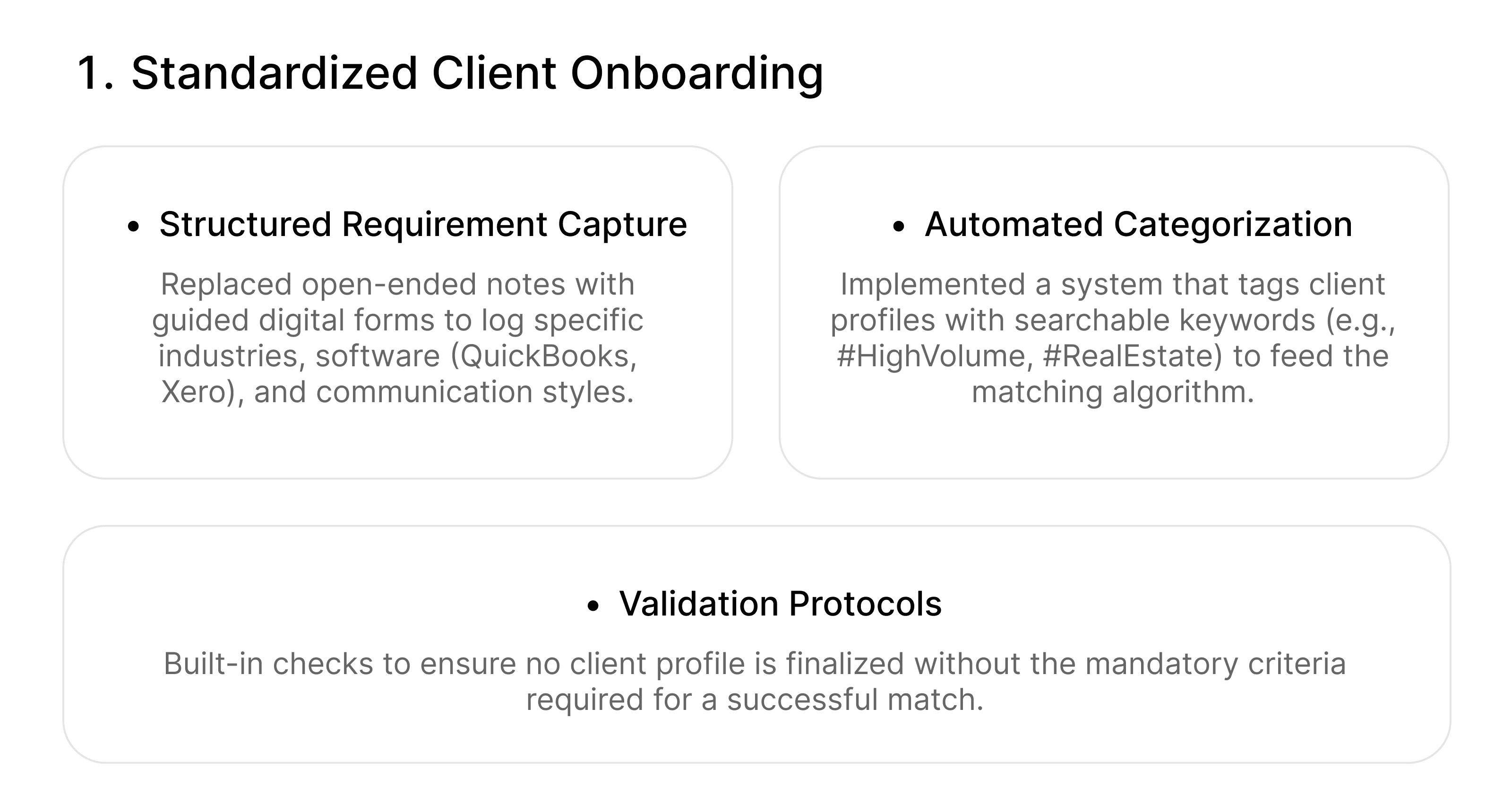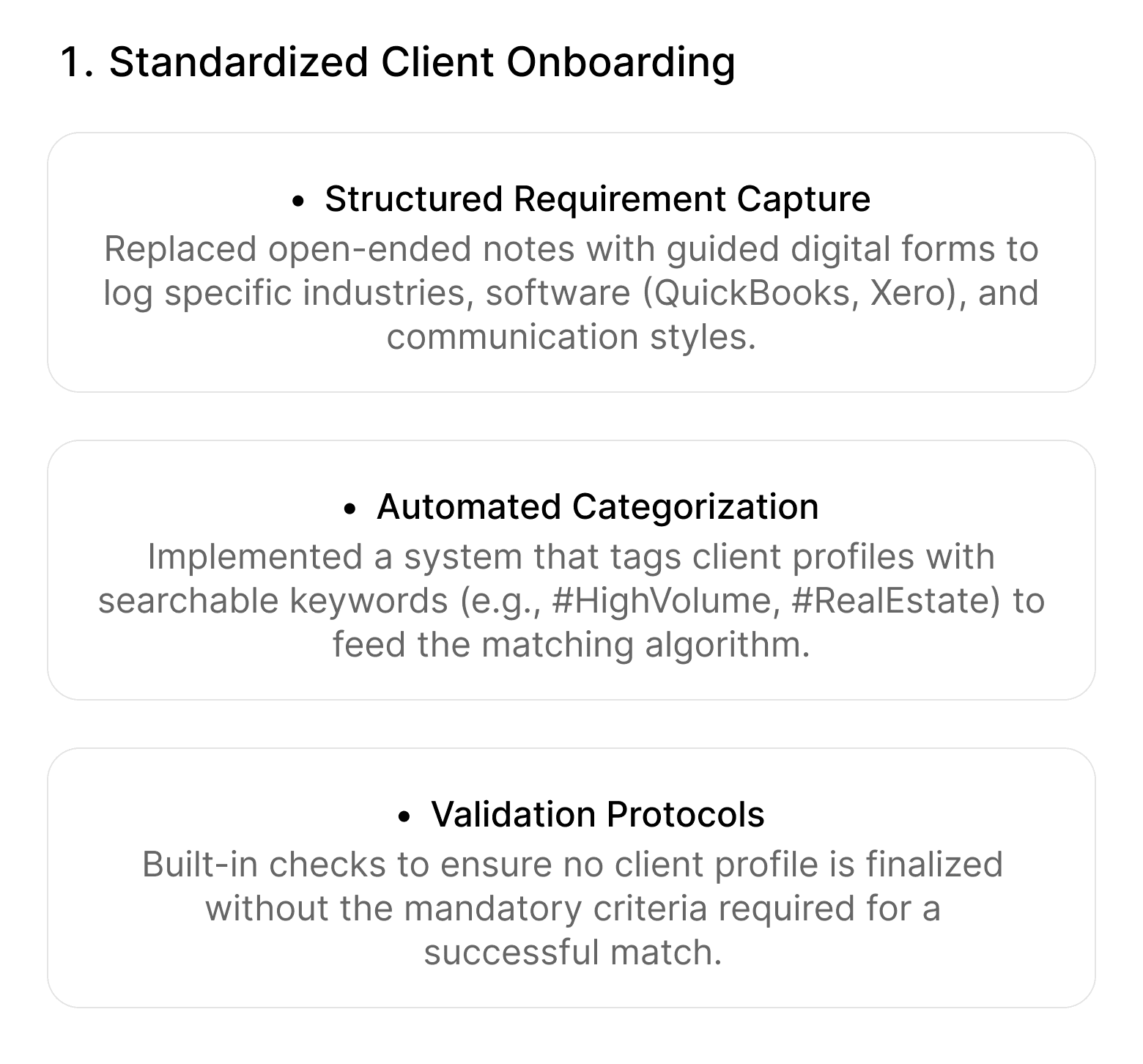 The result is a system that not only accelerates onboarding but ensures every client is paired with a professional whose expertise precisely matches their unique business requirements.