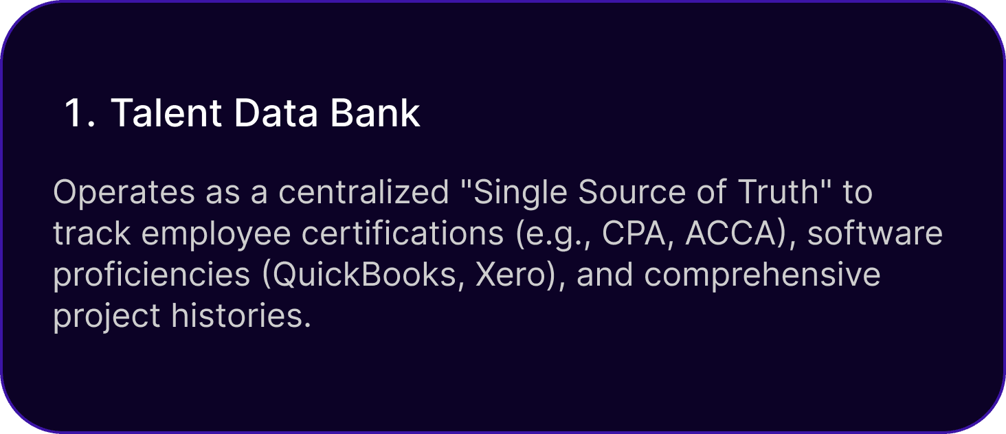 Operates as a centralized "Single Source of Truth" to track employee certifications (e.g., CPA, ACCA), software proficiencies (QuickBooks, Xero), and comprehensive project histories.