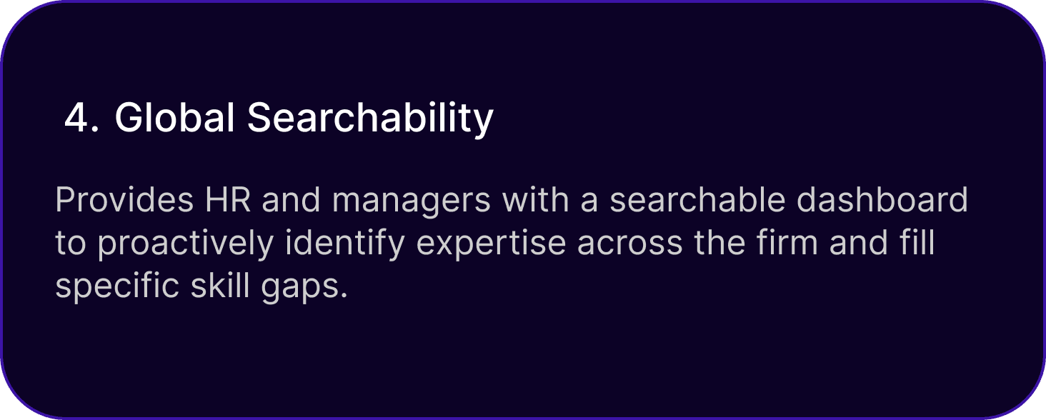 Provides HR and managers with a searchable dashboard to proactively identify expertise across the firm and fill specific skill gaps.