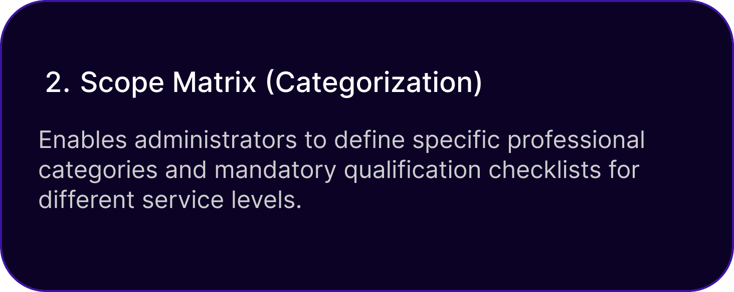 Enables administrators to define specific professional categories and mandatory qualification checklists for different service levels.