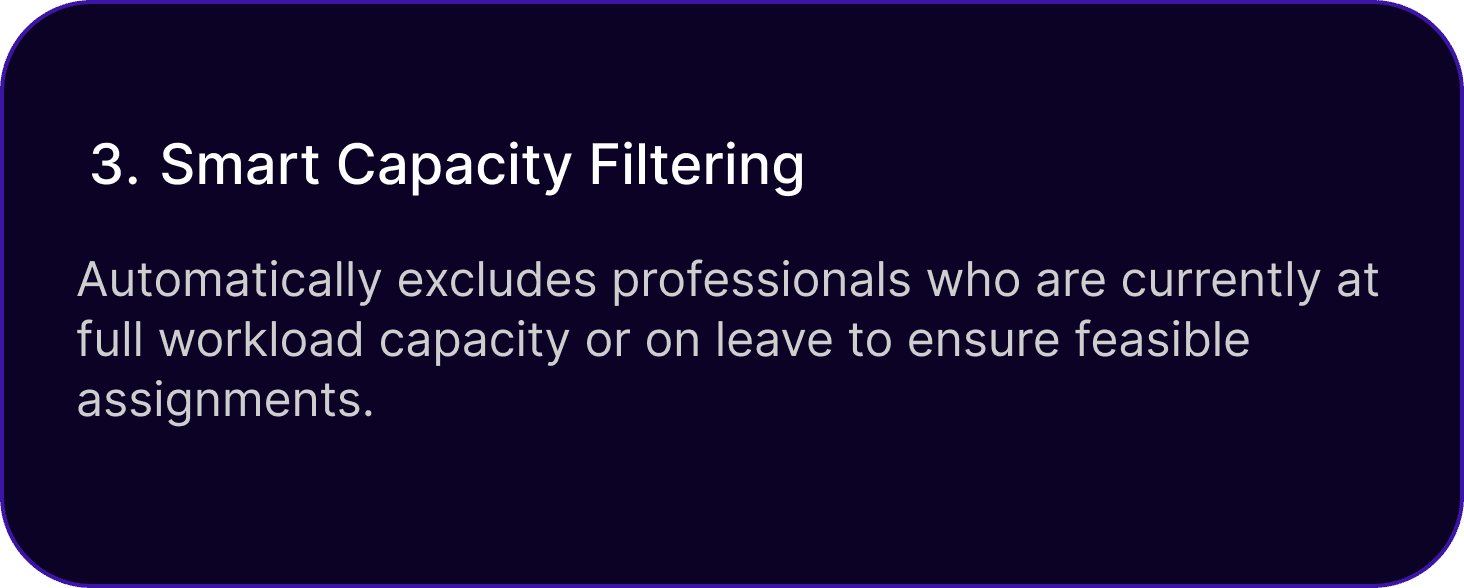 Automatically excludes professionals who are currently at full workload capacity or on leave to ensure feasible assignments.